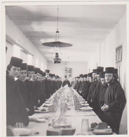 [Άγιον Όρος]: Τράπεζα μοναστηριού με μοναχούς, φωτογραφία ασπρόμαυρη, διαστάσεις 13Χ14