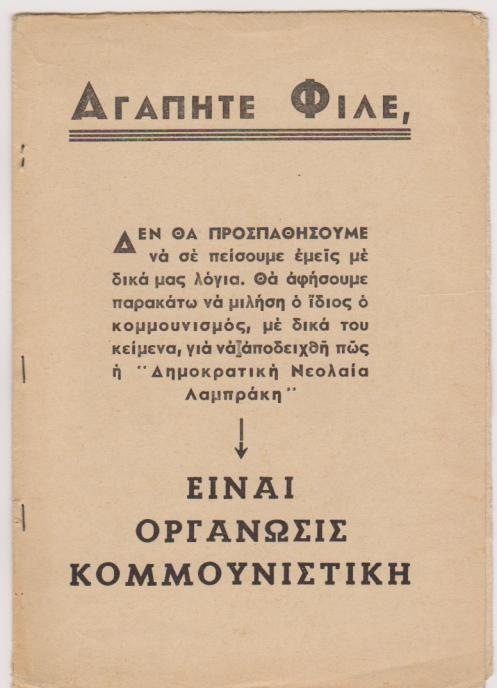 Αγαπητέ φίλε. Δεν θα προσπαθήσουμε να σε πείσουμε εμείς με δικά μας λόγια. Θα αφήσουμε παρακάτω να μιλήση ο ίδιος ο κομμουνισμός, με δικά του κείμενα, για να αποδειχθή πως η “Δημοκρατική Νεολαία Λαμπράκη” είναι οργάνωσις κομμουνιστική
