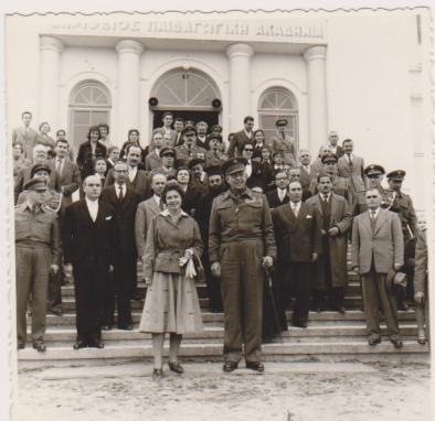 [Αλεξανδρούπολη, Βασιλείς]: Ο Παύλος και η Φρειδερίκη με επισήμους μπροστά στην Ζαρίφειο Παιδαγωγική Ακαδημία, ασπρόμαυρη φωτογραφία, Φωτο Παναγιώτου, Αλεξανδρούπολις, τέλος της δεκαετίας του ’50(;), διαστάσεις 10Χ15