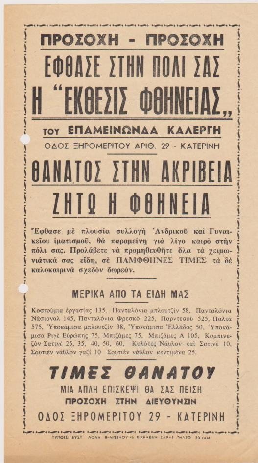 [Διαφήμιση, Κατερίνη]: [Ανακοίνωσις]. Έφθασε στην πόλι σας η “Έκθεσις φθήνειας” του Επαμεινώνδα Καλέργη…, μονόφυλλο, διαστάσεις 14Χ25, δύο τρύπες στο περιθώριο από το ντοσιέ