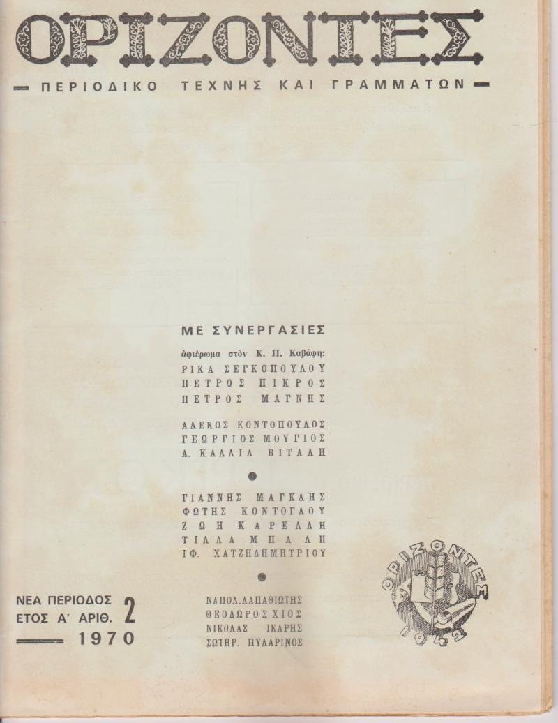 ![ΟΡΙΖΟΝΤΕΣ, περιοδικό τέχνης και γραμμάτων, Αθήνα. Νέα περίοδος, έτος Α', αριθ. 2, Απρίλιος - Ιούνιος 1970, σ.32, μεγάλο σχήμα. Από τα περιεχόμενα: Αφιέρωμα στον Κ. Π. Καβάφη * Τίλλα Μπαλή, [4 ποιήματα] * Φώτης Κόντογλου, Οι νεωτερισμοί στην Εκκλησία](https://www.old-books.gr/wp-content/uploads/2023/05/3164.jpg)