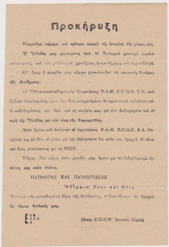 [Πολιτικά]: Διαφ. Ε.Π.Ο.Ν. Ανατολ. Τομέα [Θεσσαλονίκης], Προκήρυξη [έρανος], μονόφυλλο, [1944;], διαστάσεις 14Χ21, στο πίσω μέρος είναι γραμμένο με μολύβι απόσπασμα κειμένου σχετικού με την εποχή