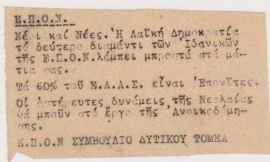 [Πολιτικά]: Ε.Π.Ο.Ν. * Συμβούλιο Δυτικού Τομέα [Θεσσαλονίκης], Φέϊγ βολάν Νέοι και Νέες…, πολυγραφημένο, [1944;], διαστάσεις 10Χ5.5