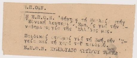 [Πολιτικά]: Ε.Π.Ο.Ν. Συμβούλιο Δυτικού Τομέα, Φέϊγ βολάν – Η Ε.Π.Ο.Ν. οδήγησε τη Νεολαία στην Εθνική λευτεριά…, πολυγραφημένο, [1944], διαστάσεις 11.5Χ5