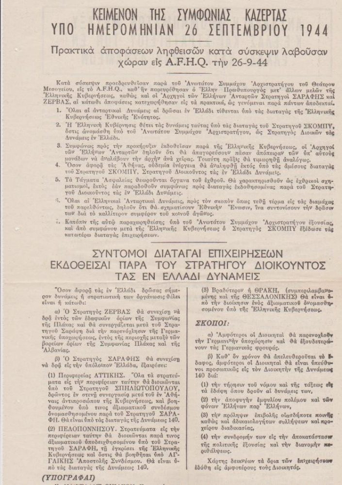 [Πολιτικά]: Κείμενον της Συμφωνίας Καζέρτας υπό ημερομηνίαν 26 Σεπτεμβρίου 1944 [στην άλλη πλευρά] Ανταλλαγή υπομνημάτων μεταξύ Κ.Ε. ΕΛΑΣ και Στρατηγείου των εν Ελλάδι κατά Ξηράν Δυνάμεων, μονόφυλλο, 1944(;), διαστάσεις 20Χ36
