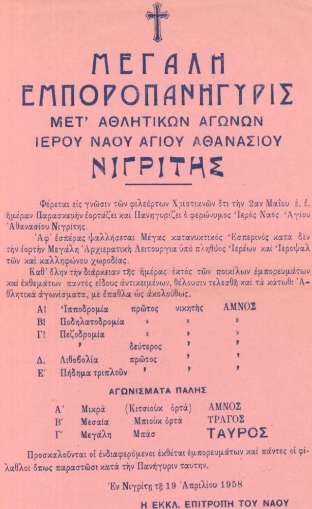 [Σέρρες – Νιγρίτα]: “Μεγάλη εμποροπανήγυρις μετ’ αθλητικών αγώνων Ιερού Ναού Αγίου Αθανασίου Νιγρίτης”, 1958, μονόφυλλο. Τα έπαθλα των αγώνων είναι αμνοί, τράγος και ταύρος